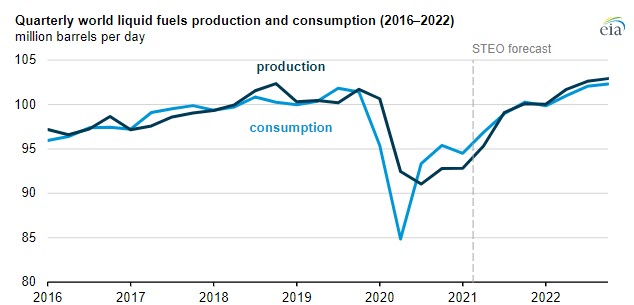 Higher crude oil prices and planned OPEC+ production increases contribute to our forecast that global petroleum supply will increase over the next several months, resulting in an essentially balanced market in the second half of 2021. We then expect petroleum inventories to build in 2022 as production outpaces consumption.