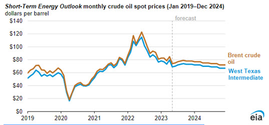 EIA lowered its crude oil price forecast for the rest of 2023 and for 2024 in the May Short-Term Energy Outlook (STEO) because of relatively rapid declines in the crude oil price since April. Between April 12, 2023, and May 4, 2023, the Brent crude oil price fell $16 per barrel (b) to $73/b; the West Texas Intermediate crude oil price fell $15/b to $69/b. We expect that a drop in OPEC production and increases in demand will lead to relatively moderate price increases over the next few months.