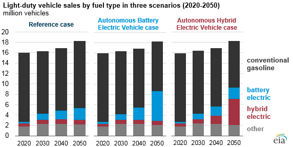 In the AEO2018 Reference case, autonomous vehicles are powered by conventional gasoline internal combustion engines. Despite the relative fuel efficiency of battery electric and hybrid electric vehicles compared with conventional gasoline internal combustion engines, more energy is consumed in both sensitivity cases (up to 4% more) compared with Reference case levels in 2050 because of increased light-duty vehicle travel. In all three cases, however, conventional gasoline engines remain the most common technology powering light-duty vehicles.