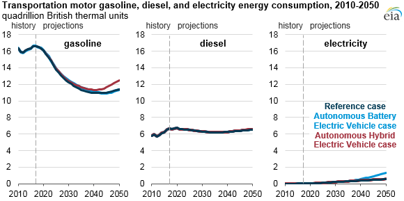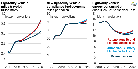 Autonomous vehicles are one of the main sources of uncertainty in the future of U.S. transportation energy consumption, as autonomous vehicle technology has the potential to change travel behavior, vehicle design, energy efficiency, and vehicle ownership. Analysis in EIA’s Annual Energy Outlook 2018 (AEO2018) shows that the widespread adoption of autonomous vehicles could increase overall light-duty vehicle travel and, depending on how those vehicles are powered, lead to slightly higher transportation energy consumption.