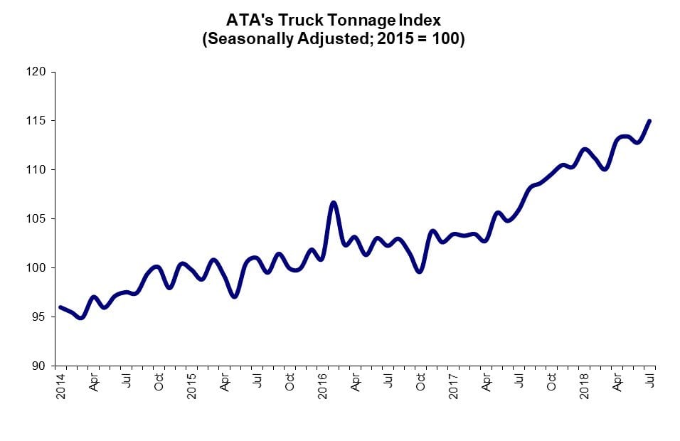 Compared with July 2017, the SA index jumped 8.6%, up from June’s 7.7% year-over-year increase. Year-to-date, compared with the same period last year, tonnage increased 8%, far outpacing the annual gain of 3.8% in 2017.
