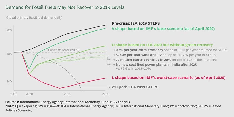 BCG’s analysis of the future energy demand and energy mix for three economic scenarios, representing V-, U-, and L-shaped recoveries, points to a high likelihood that the current crisis will significantly slow world fossil fuel demand over the coming decade. In a scenario combining slower economic recovery with moderate acceleration of the transition from fossil fuels to renewables, as suggested by the “green recovery” measures currently introduced in many countries, demand would never recover beyond 2019 levels.