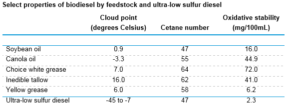 The composition and characteristics of biodiesel are distinct among the various feedstocks and their petroleum-based equivalent—ultra-low sulfur diesel (ULSD)—which is the most common type of diesel used for transportation. These attributes are considered when producing a transportation fuel that meets industry standards.