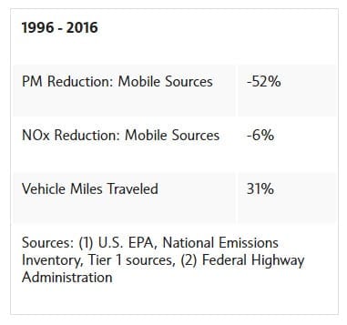 Our Ambient Air Quality is Much Improved: Oxides of nitrogen (NOx), a smog forming compound, are down 31 percent while fine particle emissions (PM) are down 21 percent between 1996 and 2016, the last full year for which EPA reports emissions data.