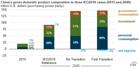 In the Fast Transition case, personal consumption—all of the goods and services purchased by consumers—accounts for a larger share of GDP in 2040 than in either the IEO2018 Reference case or the No Transition case. China’s shift to services is fastest in this case: by 2040, services make up 48% of China’s gross output. China’s total energy consumption increases by 23 quadrillion Btu, or 19% higher than the 2015 level.