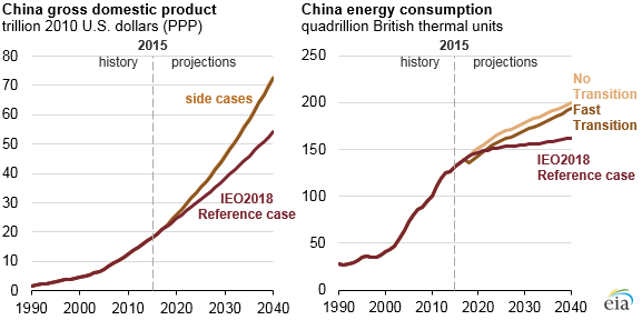 These two side cases assume a greater rate of GDP growth than the IEO2018 Reference case: real Chinese GDP is projected to grow by an average of 5.7% per year between 2015 and 2040, compared with 4.5% per year projected in the IEO2018 Reference case. The cases differ by the components of GDP responsible for this increase: one focuses on higher investment and exports compared with the IEO2018 Reference case, and the other focuses on higher personal consumption.