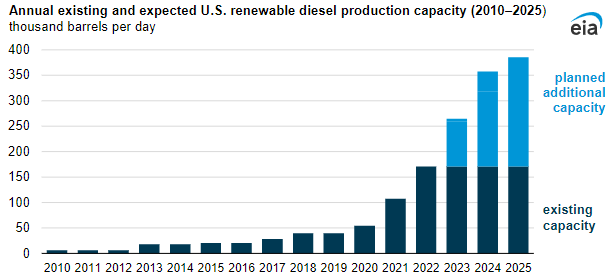 U.S. production capacity for renewable diesel could more than double from current levels by the end of 2025, based on several announcements for projects that are either under construction or could start development soon.