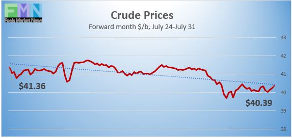WTI crude futures prices opened at $40.34 a barrel today, down by $0.72 a barrel (1.8%) from last Friday’s open of $41.06 a barrel. Today, prices are under pressure, though they have recovered from yesterday’s lows. Oil prices may end the week in the red. Our weekly price review covers hourly forward prices from Friday, July 24 through Friday, July 31. Three summary charts are followed by the Price Movers This Week briefing, which provides a more thorough review.