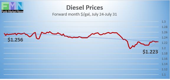 Diesel opened on the NYMEX today at $1.2235/gallon, down by 3.41 cents, or 2.7%, from last Friday’s open of $1.2576/gallon. U.S. average retail prices for diesel eased by 0.6 cents per gallon during the week ended July 27 to average $2.427/gallon. Diesel prices generally have weakened this year, missing some of the price recovery seen in crude and gasoline markets. Diesel futures prices today are roughly flat, and prices appear to be heading for a finish in the red. Contracts are moving to the next forward month. Currently, diesel is trading in the range of $1.21-$1.23/gallon. The latest price is $1.2232/gallon.