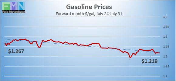 Gasoline futures prices opened at $1.237 per gallon today on the NYMEX, compared with $1.263/gallon on Friday, July 24. This was a loss of 2.6 cents (2.1%.) March brought a crippling collapse of nearly 87 cents per gallon, but prices gradually crept back up in April and May. U.S. average retail prices for gasoline retreated by 1.1 cents/gallon during the week ended July 27. Seven weeks ago, retail prices reclaimed the territory above $2 per gallon. Retail prices averaged $2.175/gallon at the national level. Gasoline futures prices have a downward tilt today, trading in the range of $1.21/gallon to $1.24/gallon. Contracts are moving to the next forward month. The week appears to be heading for a finish in the red. The latest price is $1.2186/gallon.