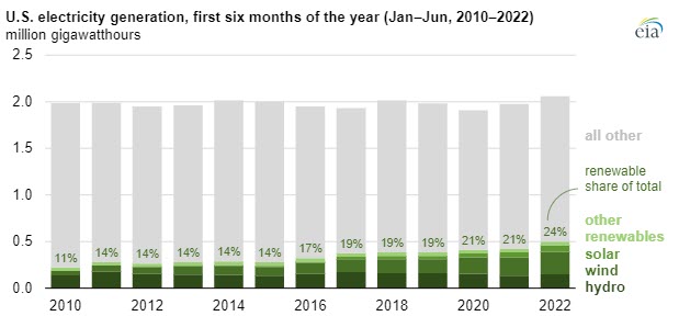 In the first six months of 2022, 24% of U.S. utility-scale electricity generation came from renewable sources, based on data from our Electric Power Monthly. The renewables’ share increased from 21% for the same time period last year. Renewables are the fastest-growing electricity generation source in the United States.