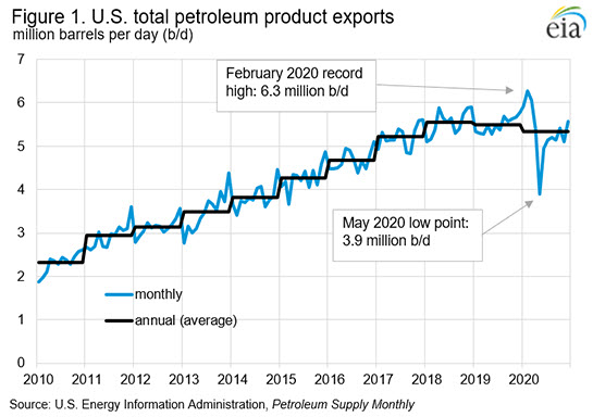 Petroleum product exports averaged a record high of 6.3 million barrels per day (b/d) in February 2020, but the demand shock from responses to the COVID-19 pandemic resulted in substantially reduced exports of petroleum products during the first half of the year, reaching a low point of 3.9 million b/d in May. Exports of petroleum products increased in the second half of 2020 to levels near the 2019 average. However, the decreased exports in the first half of the year lead to a reduction in the 2020 annual average of total product exports from 5.5 million b/d in 2019 to 5.3 million b/d in 2020 (Figure 1). Exports of most major transportation fuels, including gasoline, distillate fuel oil, and jet fuel, declined compared with 2019 levels, although propane exports in 2020 increased to record highs and surpassed distillate as the largest petroleum product export from the United States, as discussed in previous editions of This Week in Petroleum and Today in Energy.