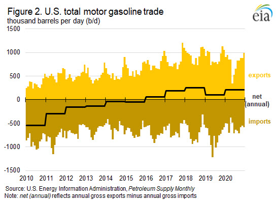 U.S. imports and exports of gasoline each declined in 2020 because of reduced demand; however, gasoline imports fell more than gasoline exports, driving net exports up (Figure 2). Consumption of U.S. finished motor gasoline (measured as product supplied) decreased to 8.0 million b/d in 2020, a reduction of 1.3 million b/d compared with 2019, reflecting reduced vehicle miles traveled because of responses to the COVID-19 pandemic. Lower U.S. domestic gasoline demand resulted in reduced imports of both finished motor gasoline and motor gasoline blending components, which together decreased 210,000 b/d from 2019 to 584,000 b/d in 2020. Reduced U.S. demand paralleled decreasing global demand for gasoline exports, and exports of U.S. gasoline also declined, falling 112,000 b/d from 2019 to 790,000 b/d in 2020. Gasoline imports decreased more than gasoline exports, and net U.S. exports of gasoline in 2020 averaged 205,000 b/d, or 99,000 b/d more than in 2019. Mexico was the largest importer of U.S. gasoline by a wide margin, averaging 441,000 b/d in 2020.