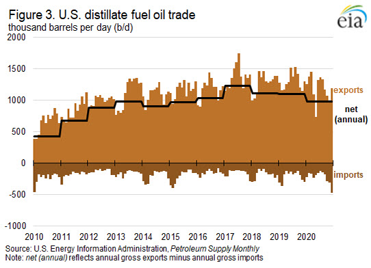 Unlike gasoline, imports of distillate fuel oil increased in 2020 to 217,000 b/d, 14,000 b/d more than in 2019 and the highest since 2010. The increased imports were more concentrated in the second half of the year, when they rose higher than the five-year high beginning in September and remained high through the fourth quarter. Despite relatively high regional inventories, the East Coast (Petroleum Administration for Defense District, or PADD, 1) still accounted for a majority of distillate imports of any of the five PADD regions, averaging 92% of total U.S. distillate imports during the fourth quarter of 2020. Product supplied of distillate fuel oil on the East Coast remained near the five-year average during the last three months of 2020, likely reflecting seasonal demand for distillate for home heating oil. The East Coast may also have imported more distillate as a result of reduced domestic refinery production owing to the closure of the Philadelphia Energy Solutions refinery in 2019 and hurricane-induced refinery outages on the U.S. Gulf Coast in the fall of 2020. Increased imports of distillate, combined with decreased exports, resulted in a decrease in net exports of U.S. distillate fuel oil to 983,000 b/d, a reduction of 121,000 b/d compared with 2019 (Figure 3).