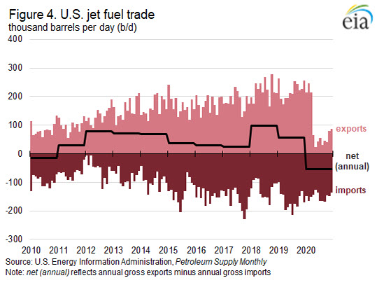 Global responses to the COVID-19 pandemic substantially affected kerosene-type jet fuel demand because numerous countries enacted restrictions on international and domestic air travel to limit the spread of the virus. In the United States, the annual average product supplied of jet fuel decreased to 1.1 million b/d in 2020, a reduction of 665,000 b/d compared with 2019. The rapid reduction in demand for the product led to reduced refinery production of jet fuel as many U.S. refiners, particularly along the U.S. Gulf Coast, shifted their product yields away from jet fuel production, which contributed to substantially reduced exports of jet fuel. In 2020, jet fuel exports averaged 95,000 b/d, down from 220,000 b/d in 2019. The decline of jet fuel imports was significantly lower than the decline in exports. In 2020, jet fuel imports averaged 150,000 b/d, down 14,000 b/d compared with 2019. As a result, the United States was a net importer of kerosene-type jet fuel, with net imports of 55,000 b/d, compared with net exports of 56,000 b/d in 2019, which marks the first year since 2010 that the United States was a net jet fuel importer (Figure 4).