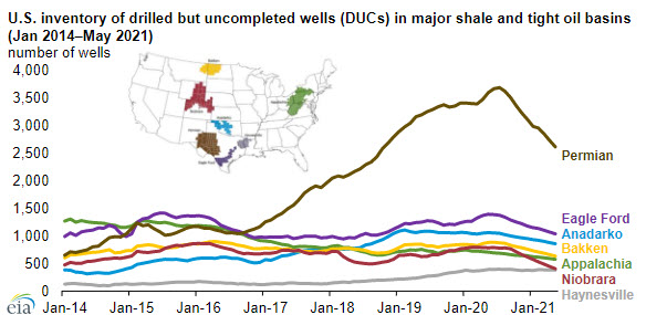 We release an updated inventory of what we consider drilled but uncompleted wells (DUCs) each month in our Drilling Productivity Report (DPR). We publish updates to DUC estimates by region in a publicly accessible spreadsheet. In May 2021, the most recent month available, we estimated that the United States has about 6,521 DUCs in seven major tight oil and shale natural gas basins, up from about 4,425 DUCs in 2013, the earliest year in the data series. Nearly 40% of DUCs (or 2,616 DUCs) are in the Permian Basin, located in western Texas and eastern New Mexico.