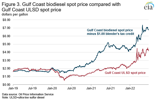 As feedstock costs have increased, biodiesel has become more expensive relative to petroleum diesel, and biomass-based diesel D4 RIN prices have had to increase to incentivize blending of biodiesel and renewable diesel. At its peak on April 28, the U.S. Gulf Coast spot price for biodiesel was $8.36/gal. Even when accounting for the $1.00/gal biodiesel tax credit that blenders receive for blending biodiesel, biodiesel spot prices were more than $3.00/gal more expensive than the $4.30/gal U.S. Gulf Coast spot price for ultra-low sulfur diesel (ULSD) (Figure 3). The margin has decreased slightly since then, reaching $2.61/gal on June 24, but remains big enough to necessitate high biomass-based diesel D4 RIN prices to drive enough blending of the fuel to meet the RFS targets.