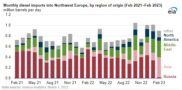 Prior to the sanctions, between October 2021 and September 2022, diesel imports from Russia made up 53% of Northwest Europe’s seaborne imports. In February 2023, when the sanctions took effect, those diesel imports fell to 2%. Although petroleum product imports from Russia have declined, imports from other areas, notably the Middle East and Asia, have increased.