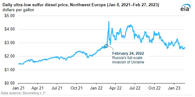 Warm weather, falling natural gas prices, and economic concerns, however, have pushed down diesel prices in Northwest Europe since January 23. The price of ultra-low sulfur diesel (ULSD) in Northwest Europe fell from $3.29 per gallon (gal) on January 23, 2023, to $2.65/gal on February 27, 2023, which is less than the price on February 23, 2022 (the day before Russia’s full-scale invasion of Ukraine).