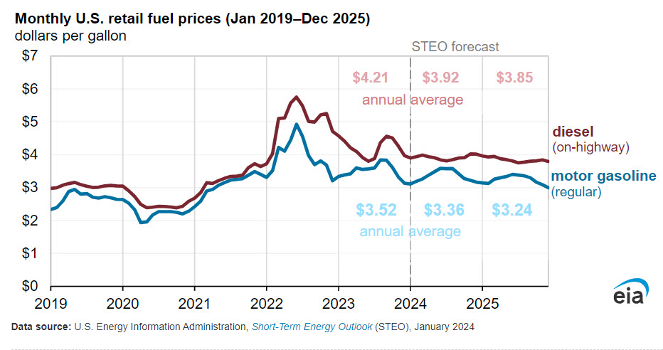In our January Short-Term Energy Outlook (STEO), we expect average U.S. retail gasoline prices to decrease in 2024 because of increased inventories related to increased refinery capacity. In 2025, we expect slightly reduced gasoline consumption to further decrease prices. We expect similar supply-side factors to lower retail diesel prices in 2024 and 2025, although U.S. diesel consumption will likely exceed 2023 in both 2024 and 2025.