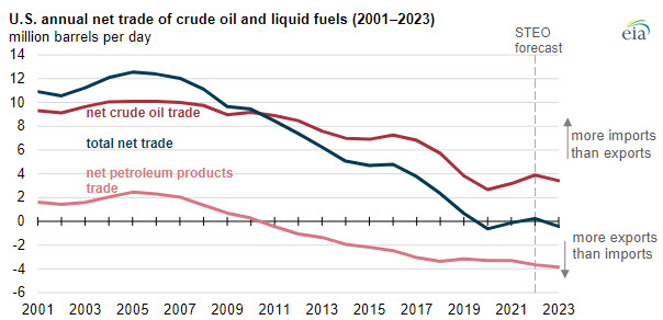 Also in 2020, the difference between U.S. crude oil imports and exports fell to its lowest point since at least 1985. Net crude oil imports subsequently rose by 19% in 2021 to an average of 3.2 million barrels per day (b/d) as crude oil consumption increased in response to rising economic activity. We forecast that the United States will continue to import more crude oil than it exports in 2022, reaching an estimated annual average of 3.9 million b/d. However, we expect net imports to fall to 3.4 million b/d in 2023. We expect the United States to import less crude oil than it exports in 2023 because we expect domestic crude oil production will increase to an all-time high of 12.6 million b/d.