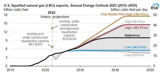 - Fast Builds Plus High LNG Price case, which assumes the same higher international natural gas prices as the High LNG Price case but also allows faster development of export facilities than in our other AEO2023 cases