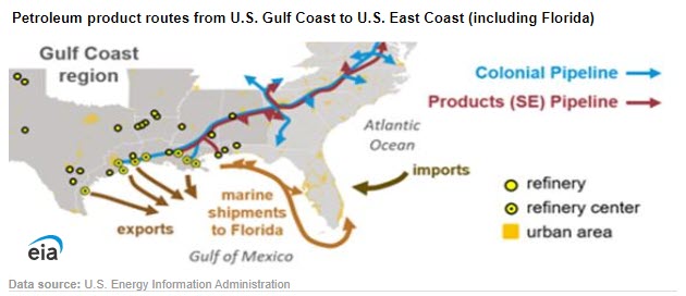 Most of Florida’s fuels arrive by water vessels from refiners on the U.S. Gulf Coast. The state has no direct access to the two major pipelines that serve other East Coast states, Colonial and Products (SE), although some portions of the state receive shipments by truck from Colonial Pipeline spurs that end in southern Georgia. The rest of the state’s fuels are imports, most of which come from Europe.