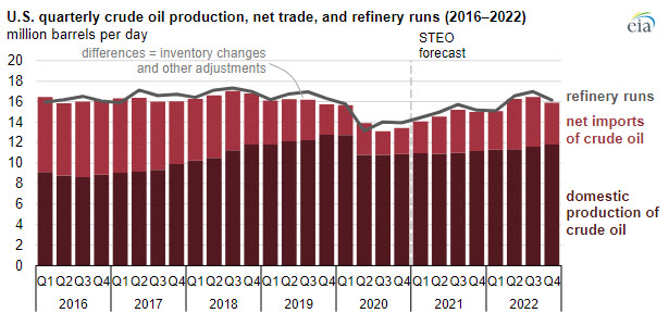 EIA expects that the United States will import more crude oil to fill the widening gap between refinery inputs of crude oil and domestic crude oil production in 2021 and 2022. U.S. crude oil production declined by an estimated 0.9 million b/d (8%) to 11.3 million b/d in 2020 because of well curtailment and a drop in drilling activity related to low crude oil prices.