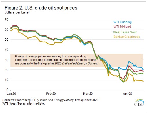According to the latest Dallas Fed Energy Survey, which surveys exploration and production companies operating in Texas, New Mexico, and Louisiana, WTI prices need to average between $23/b and $36/b to cover operating expenses for existing wells, depending on the production area. In late March, some U.S. crude oil producers received prices less than $8/b, depending on the crude oil quality and its location (Figure 2). The Bakken and West Texas crude oil prices in Figure 2 represent crude oil spot prices located near production points, and the large discounts to WTI Cushing prices reflect the significant decline in refiners’ purchases of crude oil.