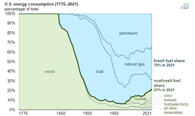 Fossil fuels—petroleum, natural gas, and coal—accounted for 79% of the 97 quadrillion British thermal units (quads) of primary energy consumption in the United States during 2021. About 21% of U.S. primary energy consumption in 2021 came from fuel sources other than fossil fuels, such as renewables and nuclear, according to data in our Monthly Energy Review.