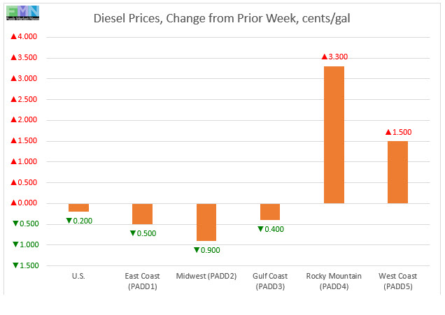 In the Gulf Coast PADD 3, retail diesel prices fell by 0.4 cents to average $2.872/gallon. PADD 3 typically has the lowest diesel prices, and it was the first PADD where retail diesel prices fell below the $3/gallon mark. Prices were 2.1 cents higher than for the same week in the previous year.