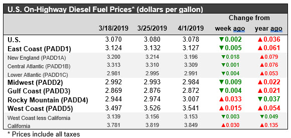 The U.S. Energy Information Administration (EIA) released its weekly data on diesel and gasoline retail prices for the week ended April 1st, 2019. Gasoline prices rose in all PADDs countrywide for the sixth week in a row, while diesel prices eased slightly. On a national average basis, retail prices for gasoline rose significantly by 6.8 cents/gallon. Retail diesel prices declined by 0.2 cents/gallon. National average prices for gasoline have been below their levels from one year ago, but they are catching up quickly. Diesel prices are higher than they were at the same time last year.