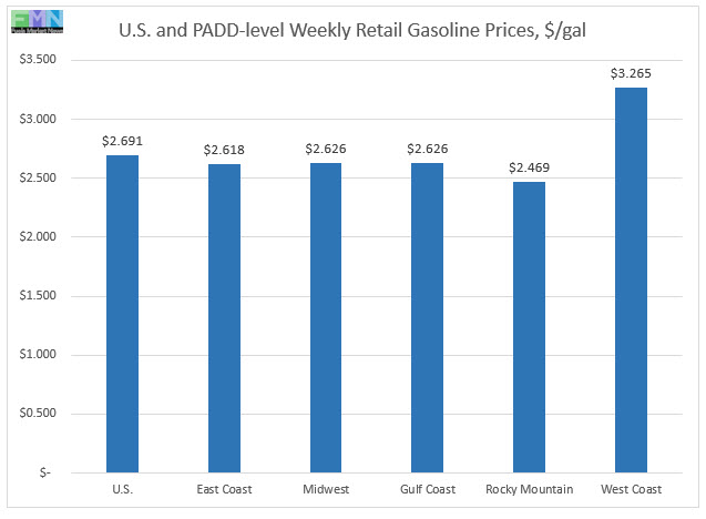 In the Midwest PADD 2 market, retail gasoline prices rose by 6.4 cents to reach an average price of $2.626/gallon. PADD 2 prices for the current week were 6.1 cents/gallon higher than they were for the same week last year.
