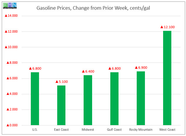 In the West Coast PADD 5 market, retail gasoline prices jumped by 12.1 cents to arrive at an average of $3.265/gallon. This was the largest price increase among the PADDs. PADD 5 continues to have the highest gasoline prices among the five PADDs. Excluding California, West Coast prices rose by 8.5 cents to average $2.934/gallon. This price was 2.4 cents lower than at the same time last year. In California, pump prices jumped by 14.0 cents to average $3.529/gallon. California prices are now 1.2 cents per gallon below their levels from the same week last year.