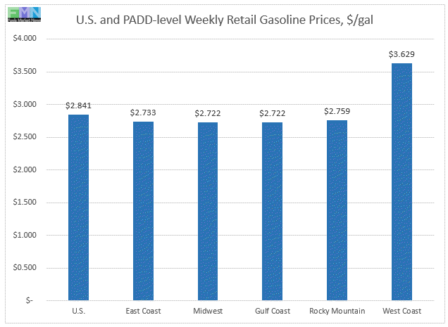 In the Gulf Coast PADD 3, retail diesel prices rose by 1.8 cents to average $2.917/gallon. PADD 3 typically has the lowest diesel prices, and it is the only PADD where retail diesel prices are still below the $3/gallon mark. Prices were 1.9 cents lower than for the same week in the previous year.