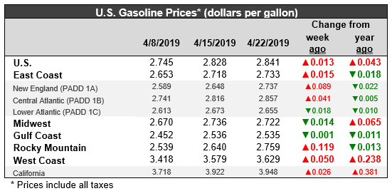 U.S. retail gasoline prices rose by 1.3 cents to average $2.841/gallon during the week ended April 22nd. Prices rose in PADDs 1, 4 and 5, while they eased in PADDs 2 and 3. Until two weeks ago, the national average price had been below last year’s levels. Retail prices for the current week are 4.3 cents per gallon higher than they were one year ago. Gasoline prices hit a peak of $2.903/gallon during the week ended October 8, 2018. Prices then slid downward for 14 weeks in a row, shedding a total of 66.6 cents per gallon. In the 15 weeks since then, prices have marched back up by 60.4 cents/gallon. Prices now are within 6.2 cents of the peak they hit in early October.