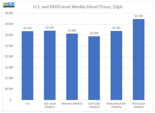 In the Gulf Coast PADD 3, retail diesel prices rose by 2.2 cents to average $2.939/gallon. PADD 3 typically has the lowest diesel prices, and it is the only PADD where retail diesel prices are still below the $3/gallon mark. Prices were 0.7 cents lower than for the same week in the previous year.