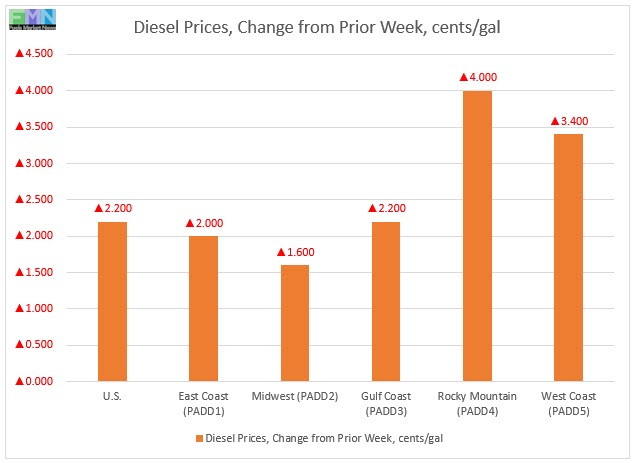 In the Rocky Mountains PADD 4 market, retail diesel prices rose by 4.0 cents to reach an average of $3.143/gallon. This was the largest price increase among the PADDs. PADD 4 prices were 3.2 cents lower than for the same week in the prior year.