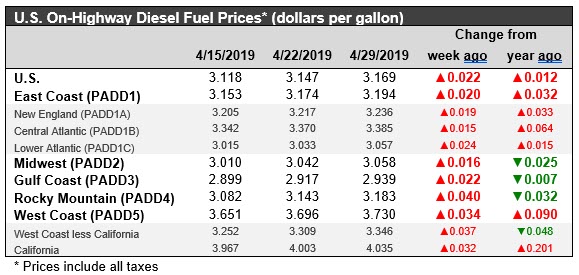 During the week ended April 26th, 2019, West Texas Intermediate (WTI) crude futures prices fell by $0.77/b (1.2%.) Gasoline futures prices increased by 4.97 cents/gallon (2.4%.) Diesel futures prices fell by 1.7 cents/gallon (0.8%.) Although the relationship between futures market prices and retail prices is not immediate and one-for-one, the most recent trend in futures prices suggests that gasoline prices will continue to rise moderately in the coming week, while diesel prices should begin to ease.