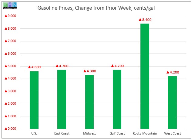 In the Rocky Mountains PADD 4 market, gasoline pump prices jumped by 8.4 cents to arrive at an average price of $2.843/gallon. This was the largest price increase among the PADDs. Prices have been rising rapidly in PADD 4, and this week brought them above last year’s levels. This week’s prices were 4.0 cents higher than at the same time last year.