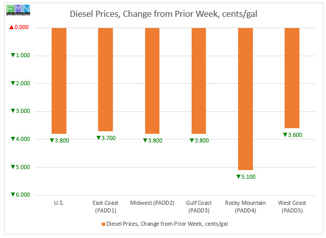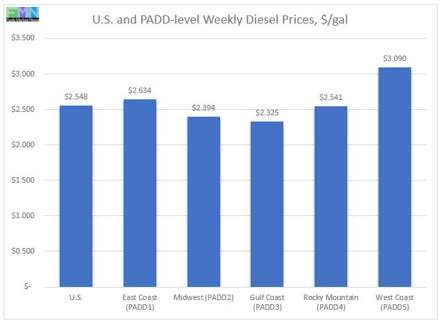 In the Rocky Mountains PADD 4 market, retail diesel prices fell by 5.1 cents to settle at an average of $2.541/gallon. This was the largest price drop among the PADDs. PADD 4 prices were 48.7 cents lower than for the same week in the prior year.