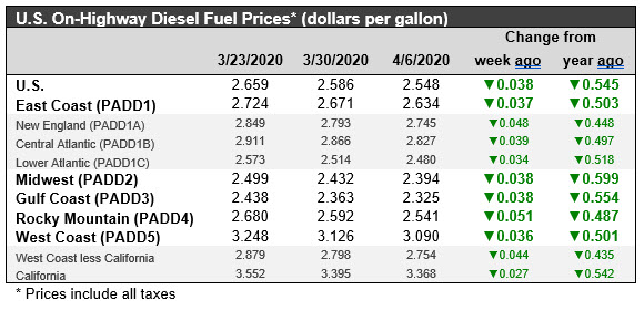 Retail prices for diesel have now fallen for thirteen consecutive weeks—every week this calendar year since the first week of January. Prices have fallen by a cumulative 53.1 cents/gallon. Retail diesel prices had been below the $3/gallon mark until the attacks on Saudi Arabian oil facilities in mid-September 2019. They rose at that time, and they remained above the $3/gallon mark until the week ended February 3, 2020. Prices have continued to decline. For the current week ended April 6th, retail diesel prices declined by 3.8 cents to settle at an average price of $2.548/gallon. For the current week ended April 6th, diesel prices fell in all PADDs countrywide. The national average price for the week was 54.5 cents/gallon below where it was during the same week last year.