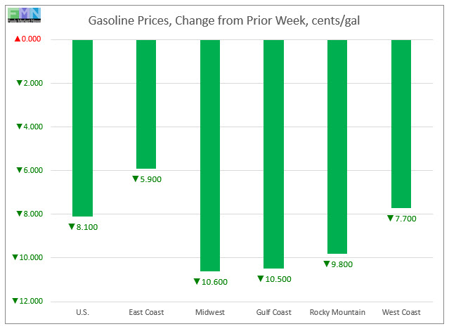 Diesel prices also had been above last year’s level, but prices are now well below their levels of last year. On a national average basis, the retail price for diesel averaged $2.548/gallon. This was 54.5 cents/gallon lower than the price in the same week last year. Retail prices for diesel have now fallen for thirteen consecutive weeks, shedding a total of 53.1 cents/gallon.