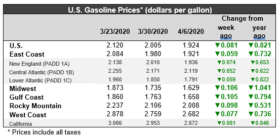 The COVID-19 pandemic has driven U.S. retail gasoline prices below the $2/gallon threshold. Average retail prices dropped by 8.1 cents/gallon to average $1.924/gallon during the week ended April 6. Prices fell in all PADDs. Retail gasoline prices for the current week were an astonishing 82.1 cents per gallon lower than they were one year ago. Until November, gasoline prices had been below their levels of last year. Prices then rose to surpass last year’s levels in all PADDs. The current downhill price slide has changed this, making gasoline a bargain again. It has been over four years since the average retail price for gasoline was below the $2/gallon mark.