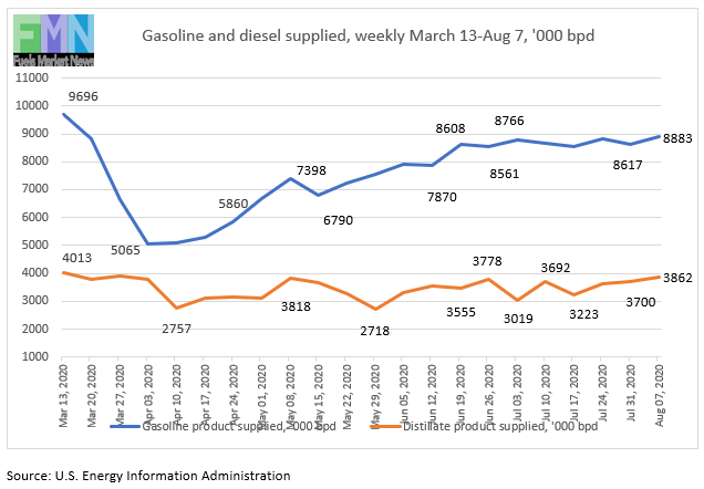 The EIA publishes weekly “product supplied” data as its proxy for demand. These data show gasoline demand crashing from 9,696 barrels per day (kbpd) during the week ended March 13 to just 5,065 kbpd during the week ended April 3, a huge hit of 4,631 kbpd in just four weeks. That was the low point. Demand thereafter trended generally up until it reached 8,608 kbpd during the week ended June 19. Since then, demand has cycled up and down. Apparent demand recovered to 8,809 kbpd during the week ended July 24, retreated to 8,617 kbpd during the week ended July 31, then jumped to 8,883 kbpd the most recent week ended August 7. The EIA points out that “product supplied” is not a precise measure of demand, but these data provide the most up-to-date numbers publicly available.
