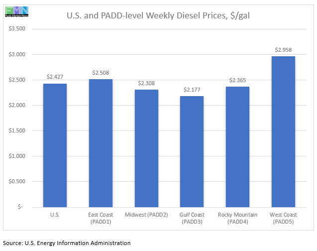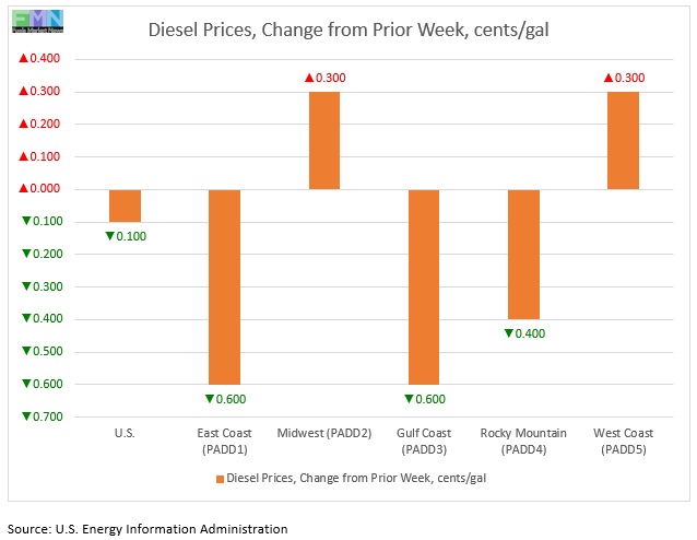 In the East Coast PADD 1, diesel prices fell by 0.6 cents to average $2.508/gallon. Within PADD 1, New England prices fell by 0.6 cents to average $2.627/gallon. Central Atlantic diesel prices decreased by 0.8 cents to average $2.684/gallon. Lower Atlantic prices fell by 0.5 cents to settle at an average price of $2.365/gallon. PADD 1 prices were 51.1 cents/gallon below their levels for the same week last year.