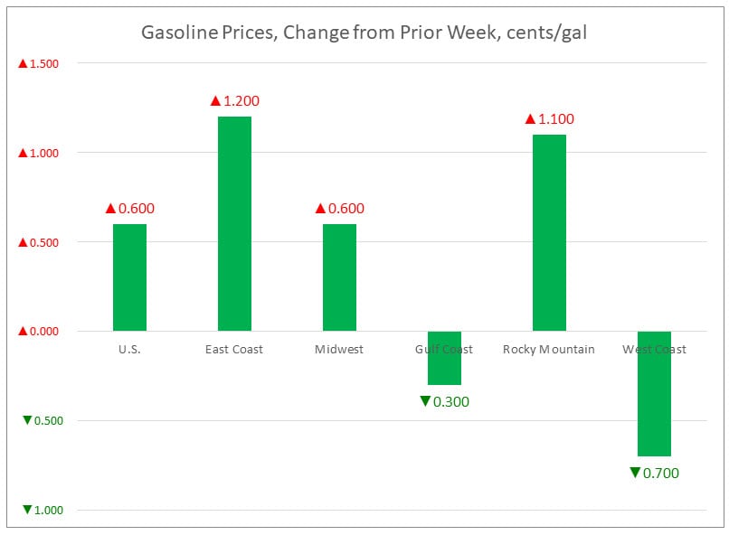 In the Rocky Mountains PADD 4 market, gasoline pump prices rose by 2.0 cents to average $2.944/gallon. PADD 4 prices were 51.8 cents higher than at the same time in 2017.