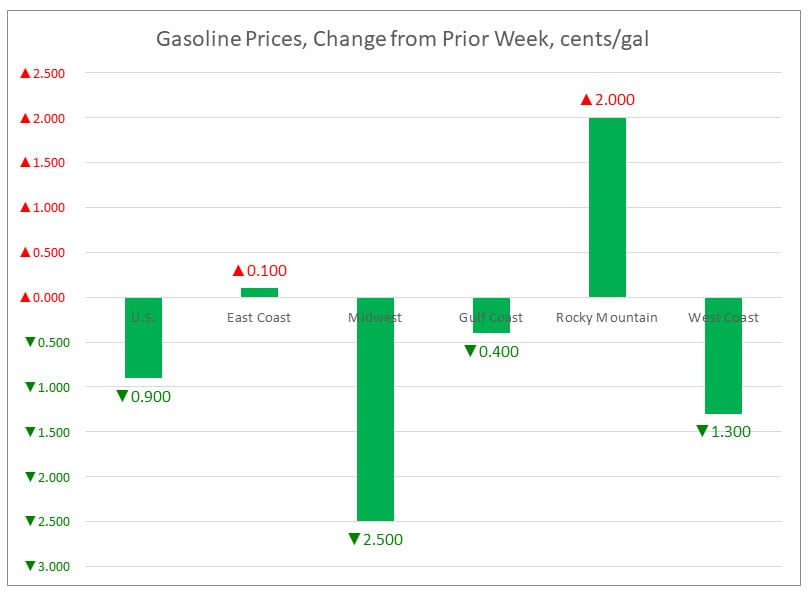 In the Midwest PADD 2 market, retail gasoline prices dropped by 2.5 cents to arrive at an average price of $2.748/gallon. This was the largest price drop among the PADDs. Gasoline pump prices were 44.9 cents higher than they were one year ago.