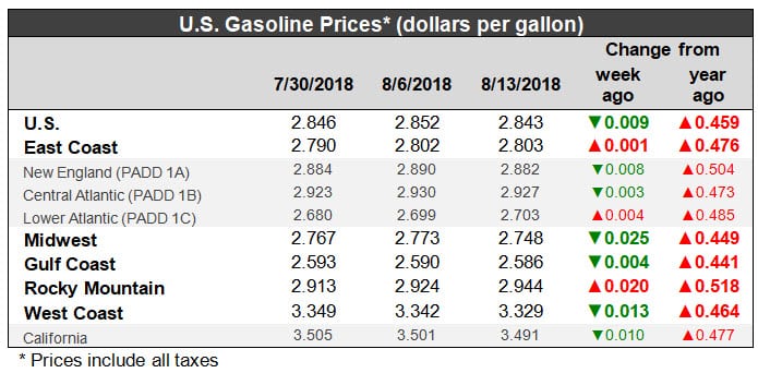 U.S. retail gasoline prices dropped by 0.9 cents to average $2.843/gallon during the week ended August 13. Prices fell in PADDs 2, 3, and 5. Prices rose in PADDs 1 and 4. The national average price was 45.9 cents per gallon higher than it was one year ago.