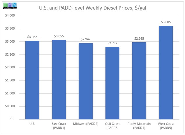 In the Rocky Mountains PADD 4 market, retail diesel prices fell by 0.2 cents to arrive at an average of $2.965/gallon. Five weeks ago, PADD 4 joined PADDs 3 and 2 in having diesel prices below $3/gallon. PADD 4 prices were 39.6 cents lower than for the same week in the prior year.